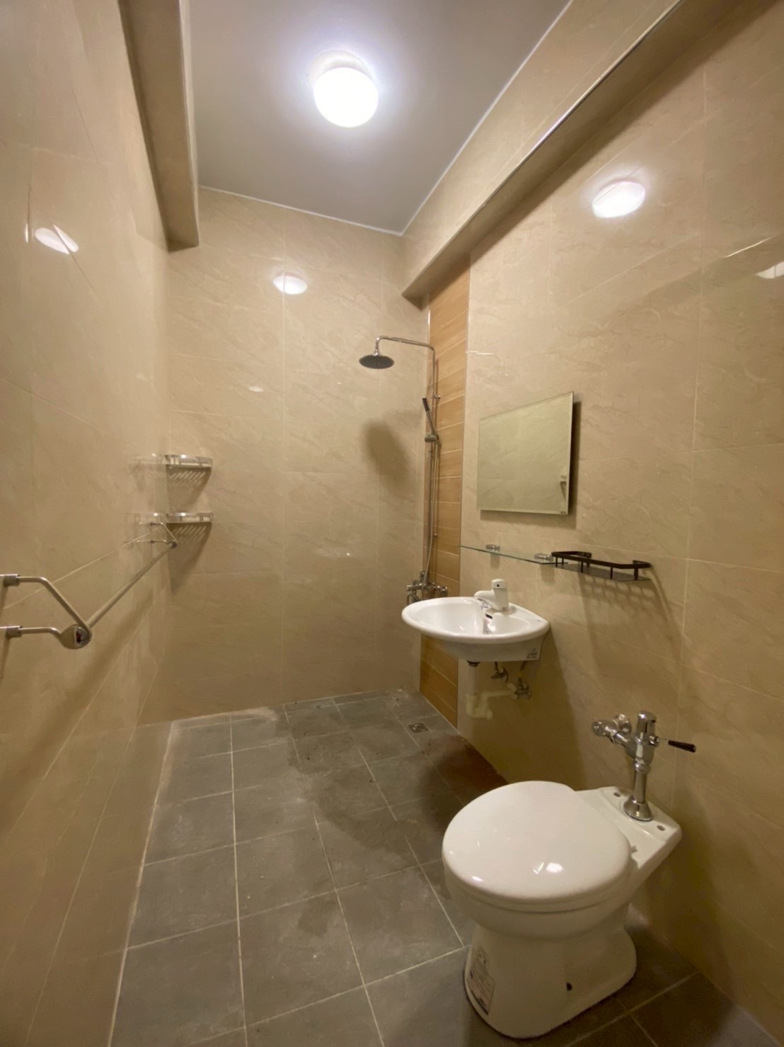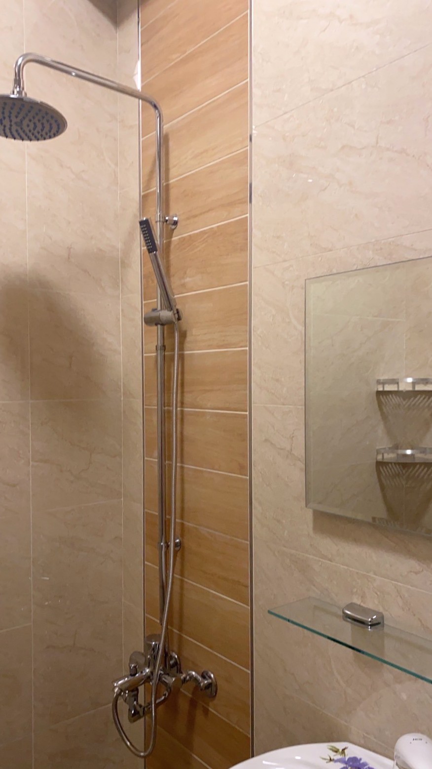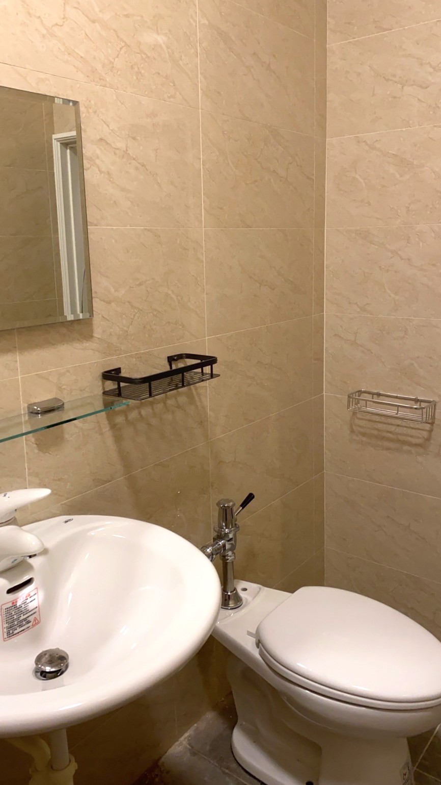 完工後的浴室採用溫暖米白與淺木紋磁磚搭配,增加空間亮度的同時,也保留舒適的溫馨感。搭配全新的鏡面、置物架與乾濕分區規劃,整體風格更現代、使用上也更順手。