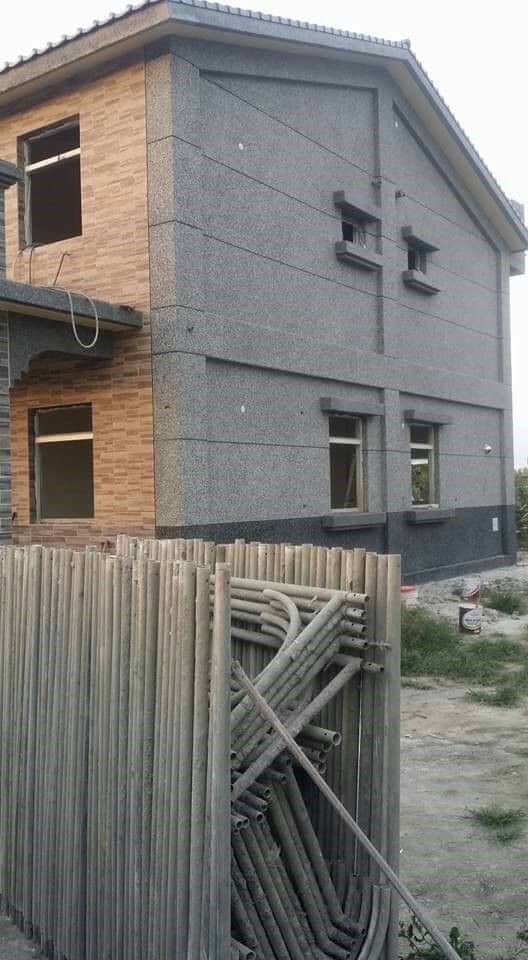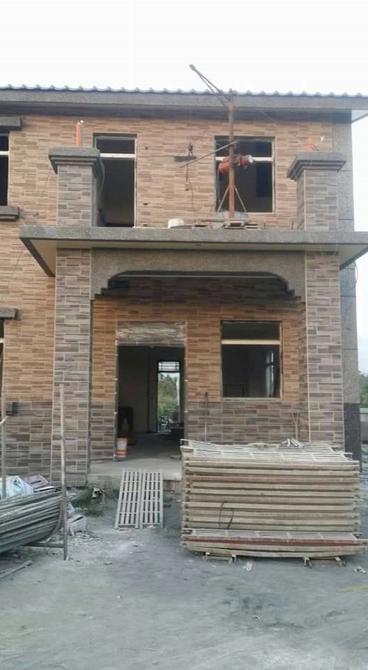 外牆採用仿石磚搭配清水模質感塗層,讓建築外觀沉穩又耐看。施作過程中包含泥作找平、地坪整備、外牆貼磚與細部收邊,確保整棟農舍兼具美觀、耐久與後期維護的便利性。